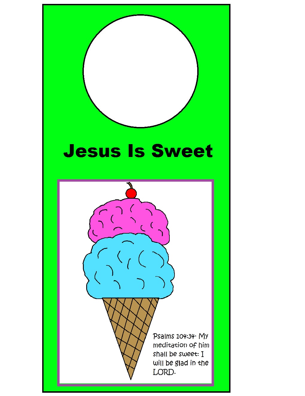 Print the Ice Cream Jesus Is Sweet Template out on card stock or printing paper. Have the kids cut it out. Run it through a laminator if you want. Use this fun doorknob hanger to go along with our "Ice Cream Jesus Is Sweet Sunday School Lesson". This comes with a coloring pages, recipe, activity pages, clipart, maze and more.