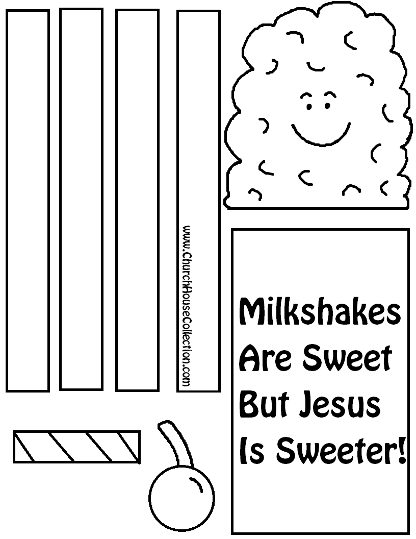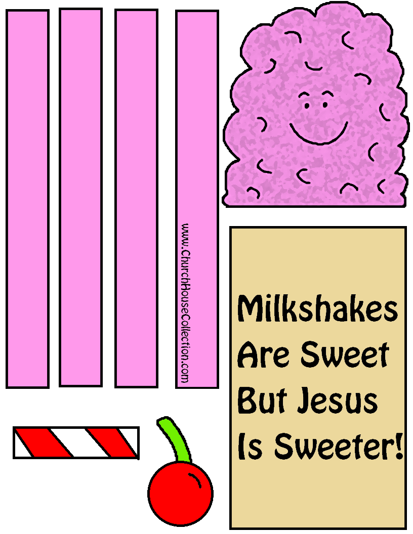Just pick out which Milkshake template you need. I made some with and without words. Once you figure that out then just print it out on card stock. If you printed the black and white milkshake template then have the kids color it first before they cut it out. Then once they get all the pieces of the milkshake cut out then have them tape it together. There is 2 arms, 2 legs, milkshake top, milkshake bottom, straw, and a cherry.